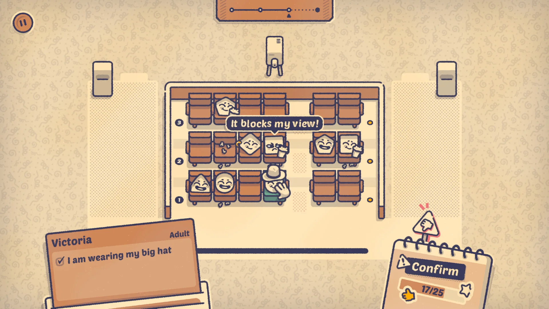 Is This Seat Taken? is a relaxed logic puzzle where you arrange people to suit their likes and dislikes. You decide who sits next to whom across charming scenarios - from movie theaters and packed buses to wedding receptions and taxis - making sure each character ends up in a spot they’re happy with.