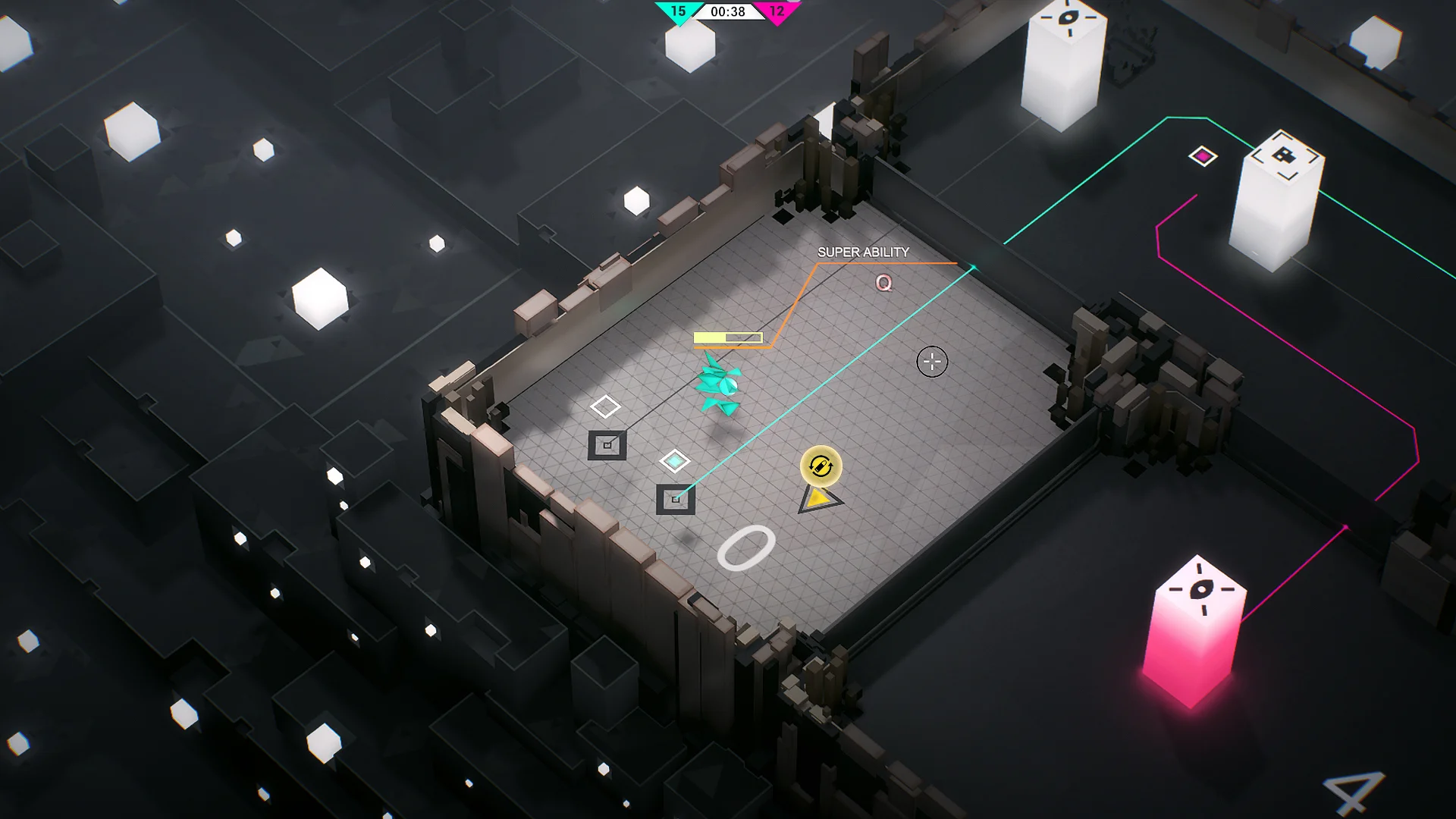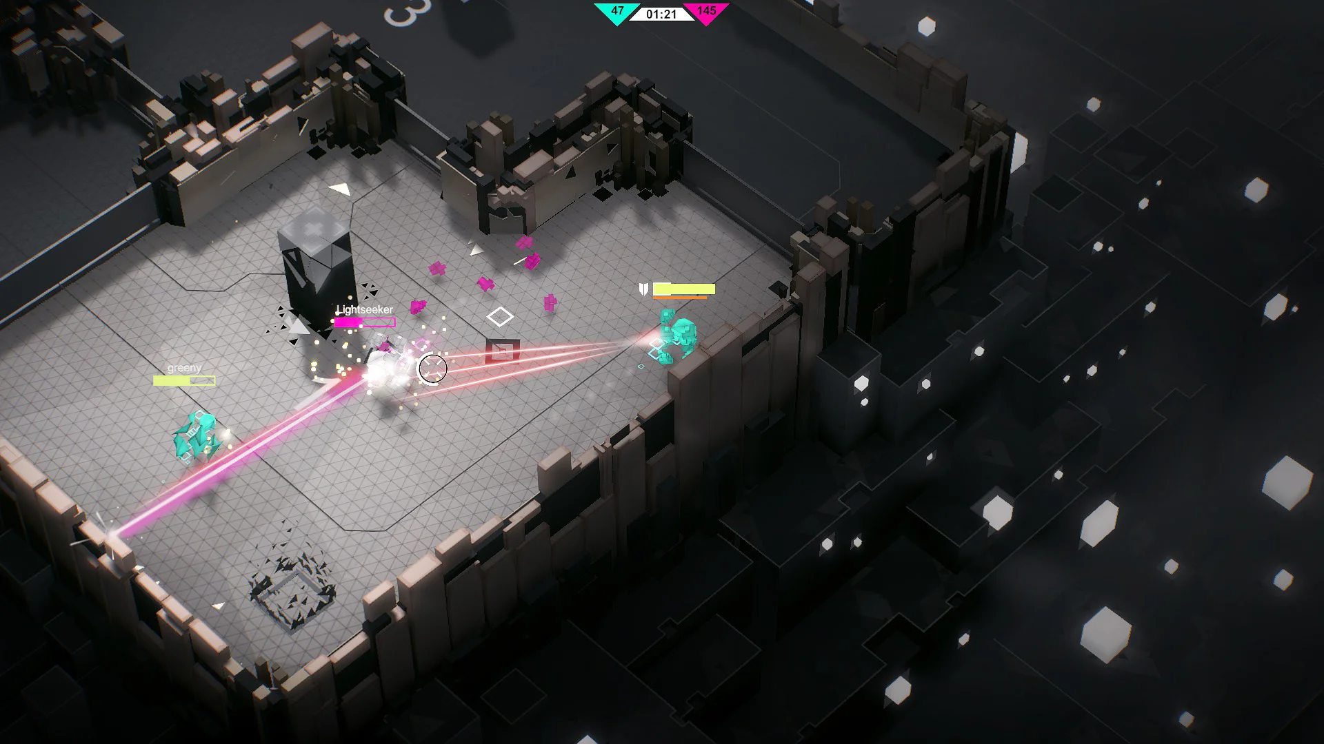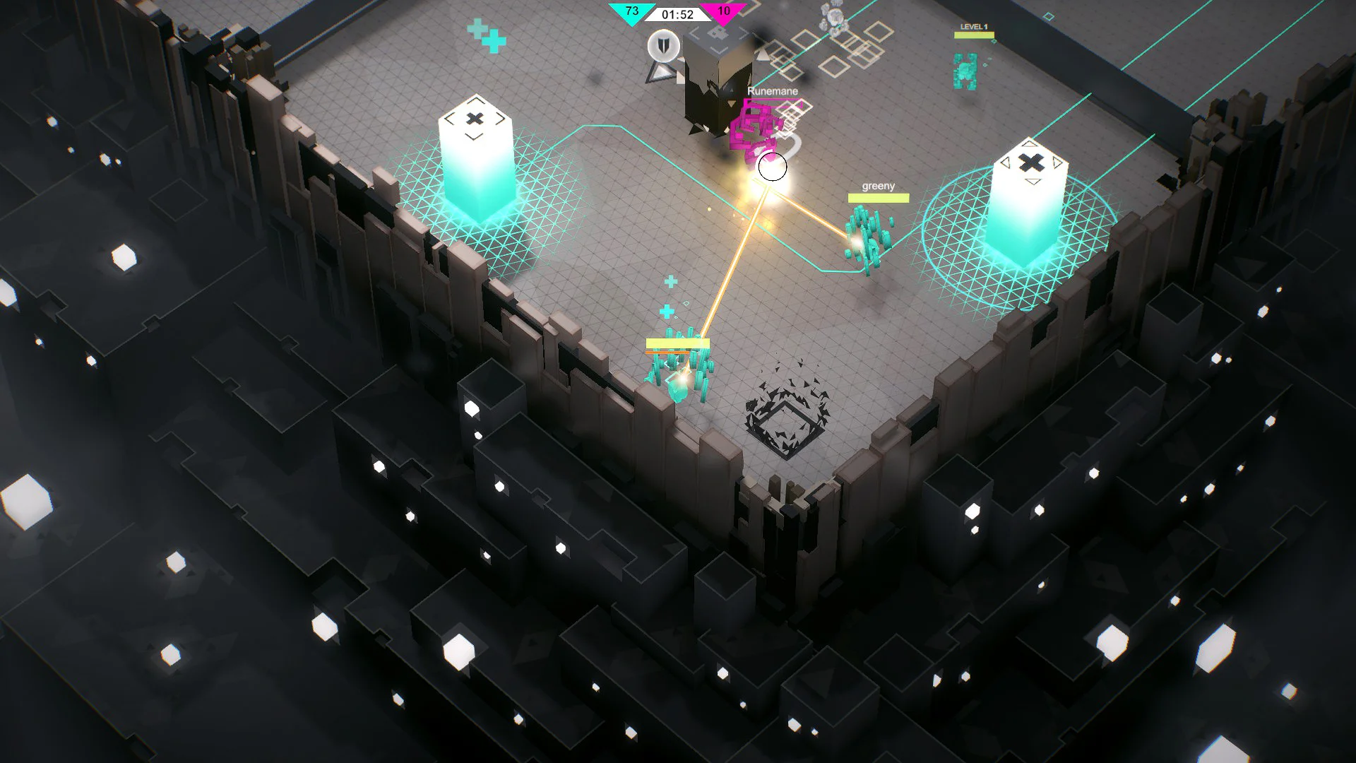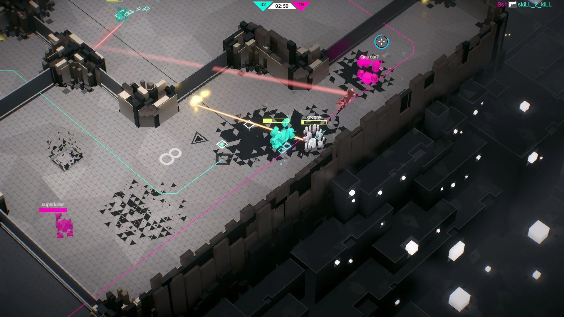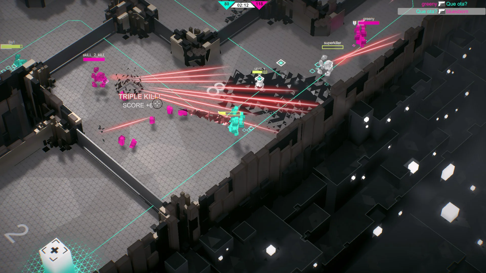 Gameplay focuses on short, intense matches played on procedurally generated mazes. Matches reward map control and quick reflexes: capture and hold System turrets to gain tactical advantages, level up your class during a match, and use unique skills and ultimates to swing fights in your favor. You can test your aim and tactics in online free-for-all or team deathmatch, or practice against AI bots in single-player mode. Progression lets you customize class builds with different skills and perks, encouraging varied playstyles and teamwork as you climb the leaderboards.