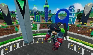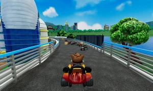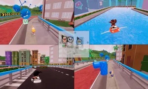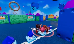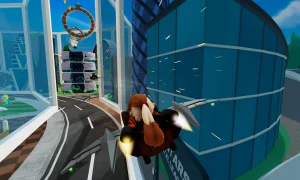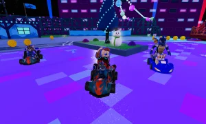 Grab and use power-up items (one in each hand) to blast, block, or set traps - clever timing and creativity pay off, from rolling critters to sneaky snares. Movement options let you run, hop into karts, buses, jetpacks, and other flying rigs to find shortcuts, assist teammates, or pull off aerial plays.