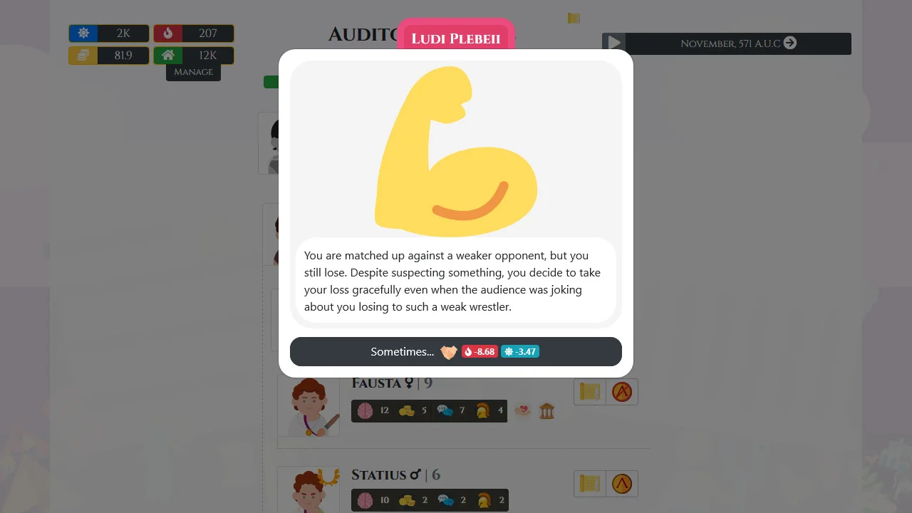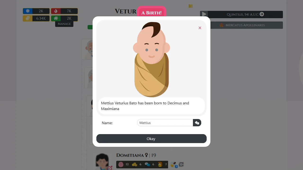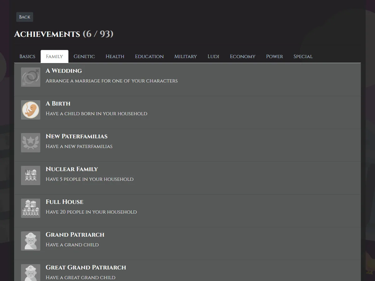 Gameplay is open-ended: there’s no fixed finish line, though ambitious families can pursue high office by climbing the Cursus Honorum and even aiming for the consulship-becoming a Novus Homo is a possible legacy. Characters age and die, and play typically continues through heirs (usually the eldest son). Fate can be harsh-fortunes and status may be lost suddenly-but the systems encourage gradual accumulation of wealth and influence, and the game never ends in a final "game over." The emphasis is on experiencing Roman life at every rank, from commoner to senator, each level bringing different goals and challenges.
