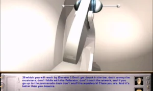 Gameplay centers on conversation and puzzle solving. The cast is a gallery of malfunctioning robots (and one semi‑deranged parrot) with distinct personalities: from the pompous Doorbot to a hypochondriac Liftbot and an overly convivial Barbot. The game’s SpookiTalk engine lets you type or select dialogue and attempt to converse, interrogate or order the crew; it’s an ambitious attempt at interactive dialogue that gives the characters real flavor and frequently produces laugh‑out‑loud lines. As you move from third class up through second and first, more areas open up and the ship’s mysteries deepen. Puzzles range from whimsical to surreal, and the strongest moments are the ones where the writing and character interactions carry you forward.