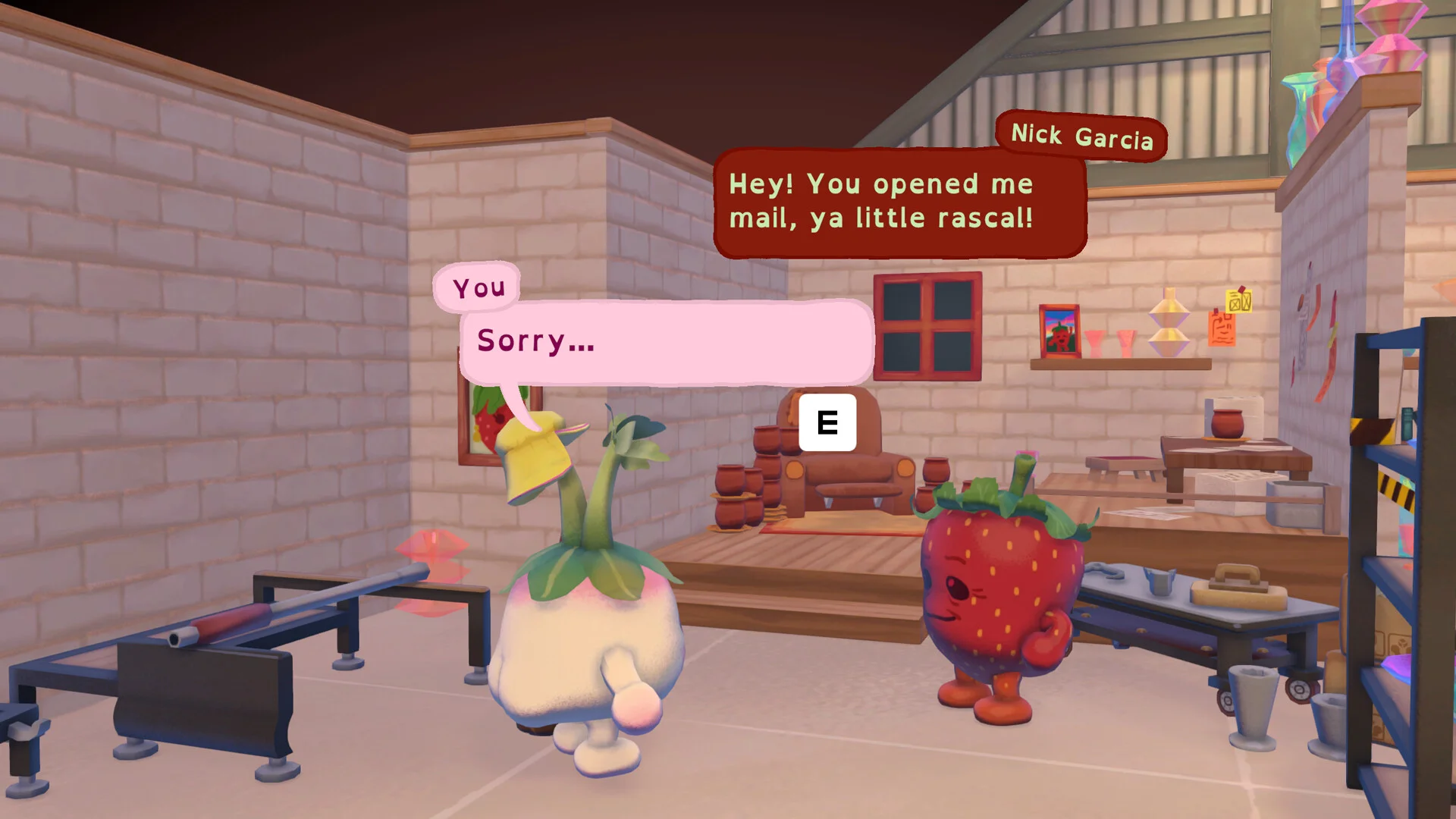 Gameplay is relaxed and deliberate. There’s no rush on Arralla Isle: exploration moves at the pace of a lazy summer day. The island is pleasingly detailed - an Aussie-inspired landscape filled with colourful characters (grouchy glassblowers, silly scientists, and other big-booty fruit folk), small environmental interactions (kick over chess pieces, throw things), and secret bits to discover. Mechanically the pictogram-matching on envelopes adds a light puzzle element, and the freedom to take photos, read about the island’s history, and even place a phone call to your mum gives it a cozy, personal feel.