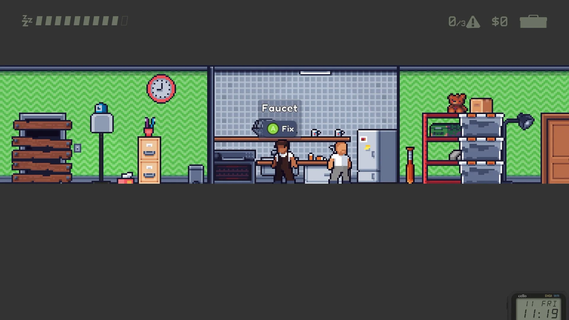 - Three playable janitors with different attributes, and 15 tenant types with individual schedules and vulnerabilities.