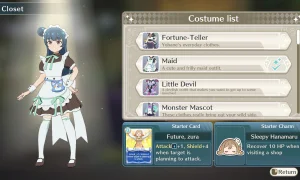 - A Closet system for changing costumes; different outfits alter your starting cards and charms, creating new playstyles.