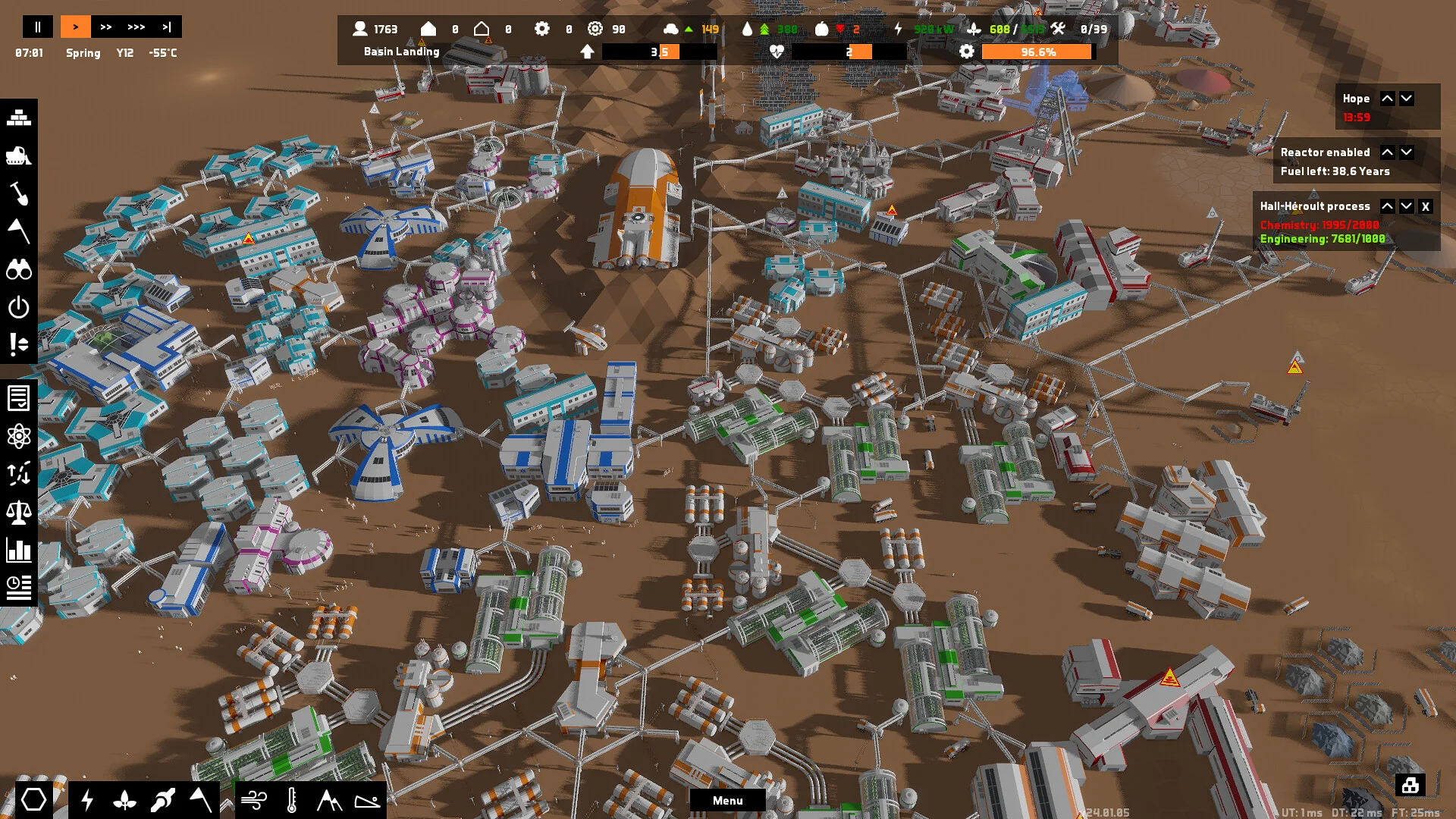Resources are scarce and must be managed carefully. Explore the surrounding terrain to locate the rest of your fleet’s supply ships and survey deposits you can exploit. Build complex production chains to manufacture a wide variety of goods - the game models 86 distinct resources with realistic recipes - and set up logistics hubs and storage so materials reach the places that need them.