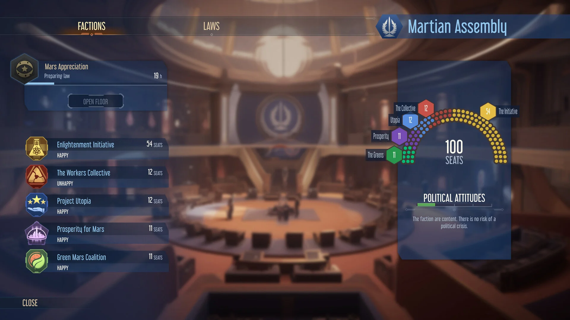 - New endgame politics: shape society with laws and pursue independence from Earth (Martian Assembly).