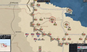 The interface is clean and user-friendly: maps and unit displays are uncluttered and easy to read, and you can choose between top-down models or traditional unit counters. Zoom out for full-battlefield situational awareness or zoom in for tactical decisions. The game map is enormous-nearly 2,000 kilometers from the Gulf of Sirte to the Suez Canal-featuring varied terrain such as sea, desert, mountains, wadis and ports, plus the long coastal Via Balbia and the desert tracks that lead into the Sahara. A built-in Scenario Editor lets you create your own battles anywhere on this vast battleground.