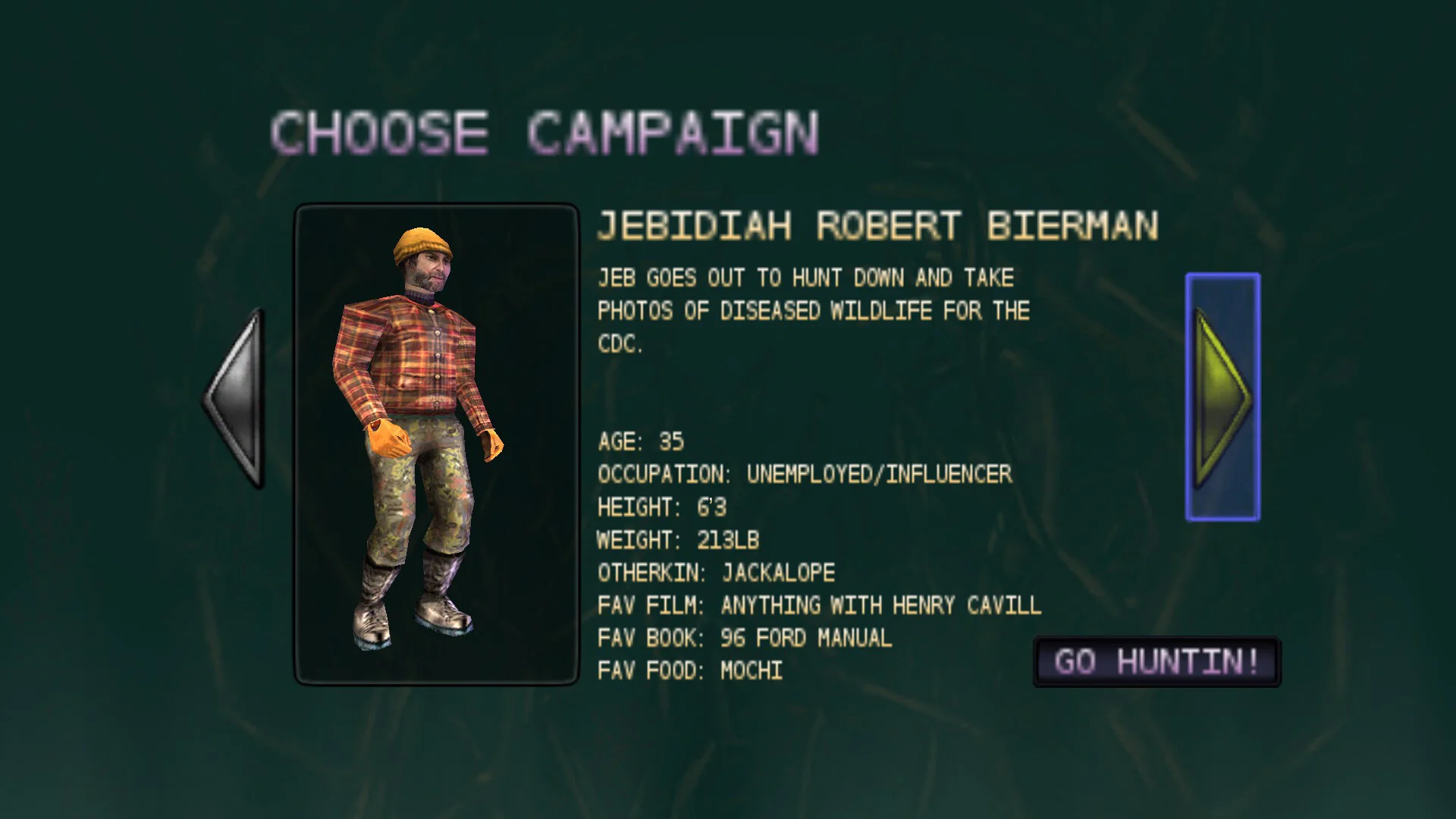 You play as Jebadiah, who answers a strange call from the CDC and is sent out to track down animals infected with a mysterious, deadly virus - documenting their grotesque bodily changes with photographs. In the new Ultimate campaign you can also play as his brother Jeeb, who takes a separate CIA contract to hunt and dispose of infected creatures...but plans to turn their meat into supplies for his failing barbecue joint instead.